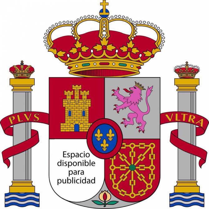 Comparto plenamente el comentario de Juan. Para que no haya dudas: El escudo de España se rige por la Ley 33/1981,1%u200B sancionada el 5 de octubre, que lo blasona en los siguientes términos: Artículo primero.%u2014 El escudo de España es cuartelado y entado en punta. En el primer cuartel, de gules o rojo, un castillo de oro, almenado, aclarado de azur o azul y mazonado de sable o negro. En el segundo, de plata, un león rampante, de púrpura, linguado, uñado, armado de gules y coronado de oro. En el tercero, de oro, cuatro palos, de gules o rojo. En el cuarto, de gules o rojo, una cadena de oro, puesta en cruz, aspa y orla, cargada en el centro de una esmeralda de su color. Entado de plata, una granada al natural, rajada de gules o rojo, tallada y hojada de dos hojas de sinople o verde. Acompañado de dos columnas de plata, con la base y capitel de oro, sobre ondas de azur o azul y plata, superada la corona imperial la diestra, y de una corona real la siniestra, ambas de oro, y rodeando las columnas una cinta de gules o rojo, cargada de letras de oro, en la diestra "Plus" y en la siniestra "Ultra", (del latín Plus Ultra, Más Allá). Al timbre, Corona Real cerrada, que es un círculo de oro, engastado de piedras preciosas, compuesta de ocho florones de hojas de acanto, visible cinco, interpoladas de perlas y de cuyas hojas salen sendas diademas sumadas de perlas, que convergen en el mundo de azur o azul, con el semimeridiano y el ecuador en oro, sumado de cruz de oro. La corona forrada de gules o rojo. Artículo segundo.%u2014 El escudo de España, tal y como se describe en el artículo anterior, lleva escusón de azur o azul, tres lises de oro puestas dos y una, la bordura lisa de gules o rojo, propio de la dinastía reinante (Borbón-Anjou). Escudo de España: Blasón Cuartelado con las armas del Reino de Castilla, Reino de León, REINO DE ARAGÓN y Reino de Navarra, con el escusón de Borbón-Anjou al centro y en la punta las armas del Reino de Granada - Juan | 08/10/2017 12:41h.