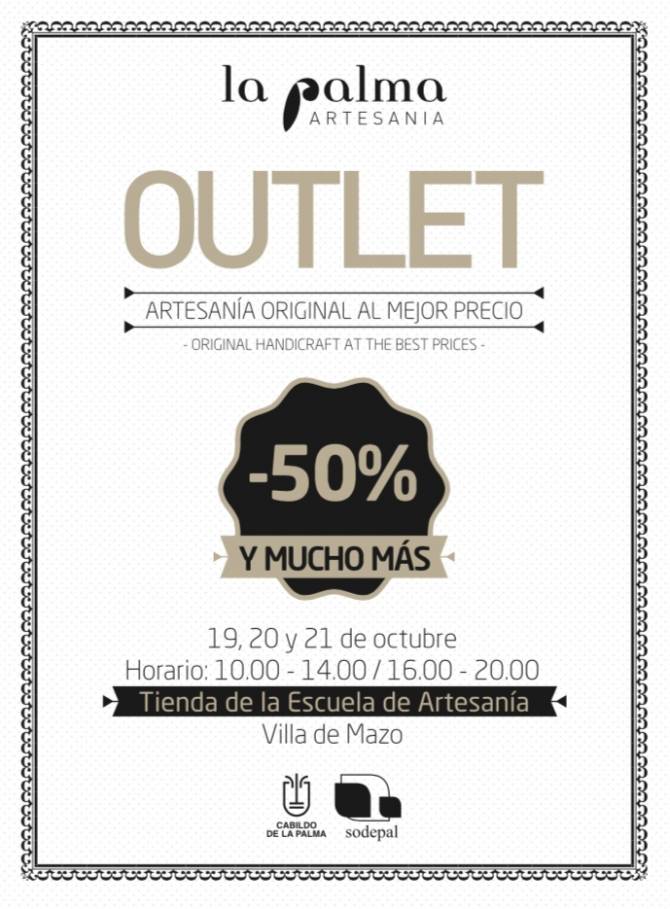 El Cabildo Insular de La Palma, a través de la empresa pública Sodepal y la Consejería de Artesanía, ha organizado un outlet en la Escuela Insular de Artesanía, en Villa de Mazo, para los días 19, 20 y 21 de octubre en los que se podrá adquirir productos de la marca La Palma Artesanía a mitad de precio.