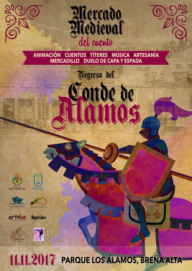 La Villa de Breña Alta experimentará un viaje en el tiempo el próximo sábado, 11 de noviembre, con el recibimiento del Conde de Álamos. La llegada de este singular personaje al municipio, que retorna a su tierra con sus soldados y tesoros después de librar incontables batallas, se enmarca dentro del Mercado Medieval del Cuento que se celebrará, en el Parque de Los Álamos, de 10:30 a 14:00 horas, y que transformará este recinto cultural en un mundo de fantasías y misterio.