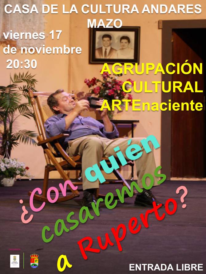 La Casa de la Cultura Andares de Villa de Mazo acogerá este viernes, 17 de noviembre, a las 20:30 horas, la representación teatral ¿Con quién casaremos a Ruperto?, una obra enmarcada en el programa del proyecto cultural impulsado por el Cabildo de La Palma Una Isla en Escena de entrada libre y gratuita.