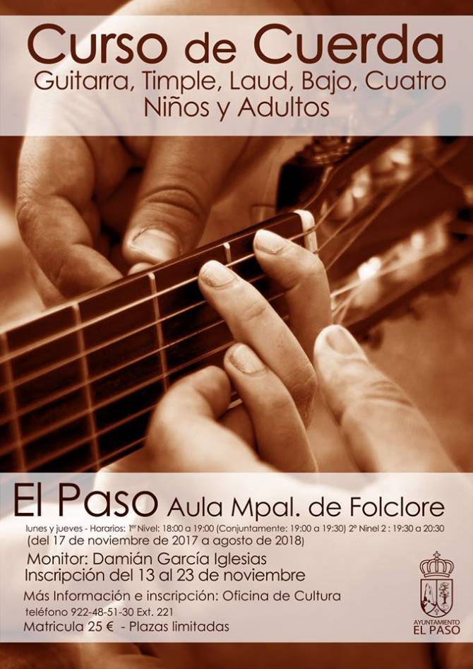 Mientras que el curso de cuerda incluye la posibilidad de aprender o mejorar las técnicas en los siguientes instrumentos: Guitarra, Timple, Laud, Bajo y Cuatro. Las clases serán en el Aula Municipal de Folclore de El Paso. Los lunes y jueves. En horarios para el Primer Nivel de 18:00 a 19:00 horas y de 19:30 a 20:30 horas para los de segundo nivel. El monitor del curso de cuerda será Damián García, las plazas están limitadas y el curso durará hasta agosto del 2018. La fecha de cierre de inscripciones será el 23 de noviembre en la oficina de cultura del ayuntamiento donde también podrá obtener más información o en el teléfono 922-48-51-30 Ext. 221