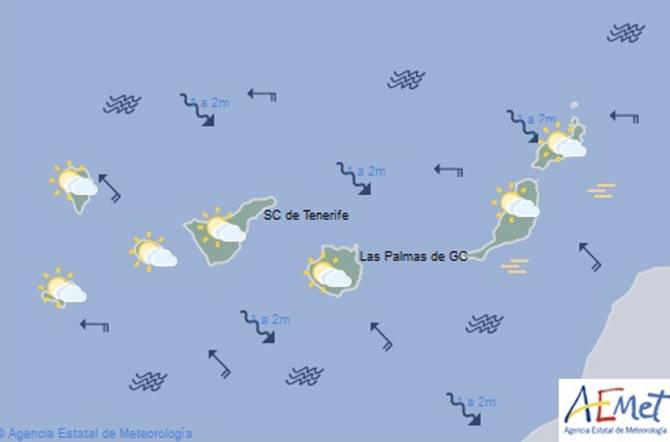 Viento del este a sudeste, más intenso en costas sur y norte. En el oeste, predominio de las brisas. En medianías y zonas altas fuerte durante la primera mitad del día.