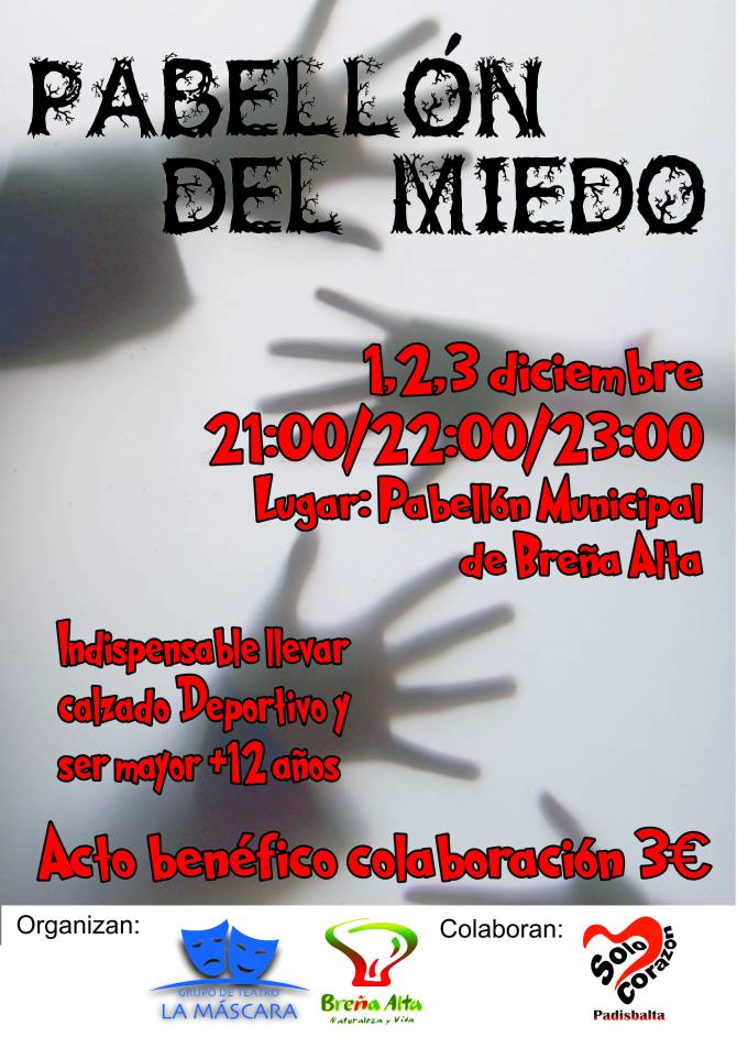 El Pabellón Municipal de Deportes de la Villa de Breña Alta acogerá los próximos días 1, 2 y 3 de diciembre el espectáculo teatral El pabellón del miedo organizado por el Ayuntamiento y el Grupo de Teatro La Máscara con el objetivo de recaudar fondos para la Asociación Padisbalta.