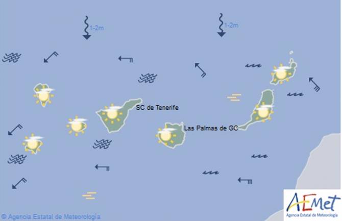 Viento de componente este flojo a moderado, más intenso en costas norte y sur, en donde las rachas podrían alcanzar los 60 km/h.