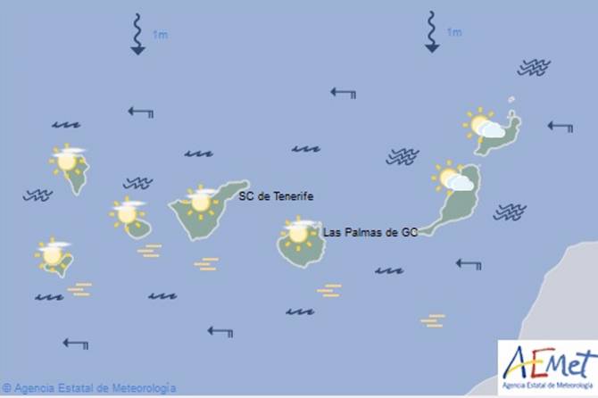 Las previsiones meteorológicas para este miércoles en la isla apuntan a la existencia de intervalos de nubes altas, con algún intervalo de nubes bajas en el norte de la isla por la tarde, donde no se descarta alguna lluvia débil ocasional por la tarde.