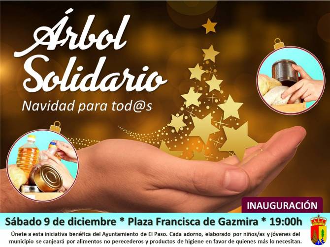 Este sábado 9 de diciembre, desde las 19:00 horas y en El Paso, el espíritu de la Navidad se elevará al cielo, con la colocación y encendido, por segundo año consecutivo, del Árbol Solidario que se ubicará en la Plaza Francisca de Gazmira, en pleno centro del municipio.