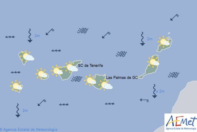 Viento del nordeste con brisas en costa oeste; en medianías y zonas altas, de componente este.
