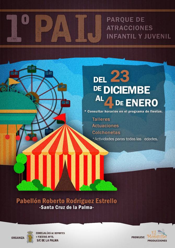 El Ayuntamiento de Santa Cruz de La Palma pone en marcha estas Navidades una iniciativa para que niños y jóvenes dispongan de un espacio de ocio y diversión durante el periodo vacacional. El Parque de Actividades Infantiles y Juveniles (PAIJ) de Santa Cruz de La Palma abrirá sus puertas este sábado a partir de las 17:30 horas en el Pabellón Roberto Rodríguez Estrello.