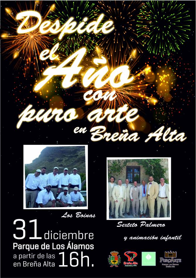 La Villa de Breña Alta despedirá el año el próximo domingo, 31 de diciembre, con una gran fiesta en el Parque Los Álamos que amenizarán, a partir de las 16:00 horas, los grupos Los Boinas y Sexteto Palmero. El Ayuntamiento, a través del proyecto cultural Puro Arte, y con la colaboración del Bodegón Los Álamos, ha organizado este evento festivo que ofrece, además, un programa de animación infantil para que los breñuscos puedan disfrutar en familia del último día de 2017 y darle la bienvenida a 2018.
