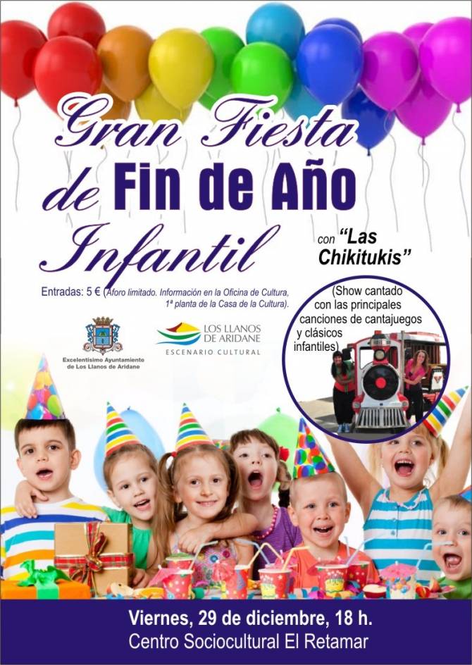 Los niños serán los primeros en brindar por el Año Nuevo en una Fiesta Infantil que dará comienzo el viernes 29 a partir de las 18:00 horas en el Centro Cultural de El Retamar y que contará con la actuación del grupo tinerfeño “Las Chikitukis”. Un show musical de lo más particular, que incluye algunas de las principales canciones de los populares cantajuegos y del cancionero tradicional, con merienda incluida y que finalizará con un gran cotillón para que los más pequeños despidan el año a lo grande.