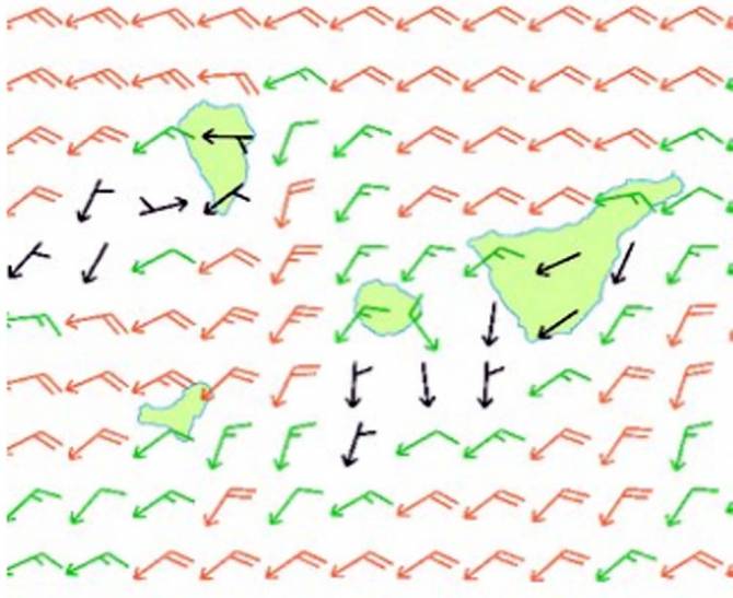 Viento del nordeste moderado en costas, más intenso en costas noroeste y sudeste; en costa oeste, predominio de las brisas; en medianías y en cumbres, viento de componente este fuerte durante la madrugada y primeras horas del día, con rachas que ocasionalmente pueden alcanzar los 60-75 km/h en zonas altas de la vertiente oeste.