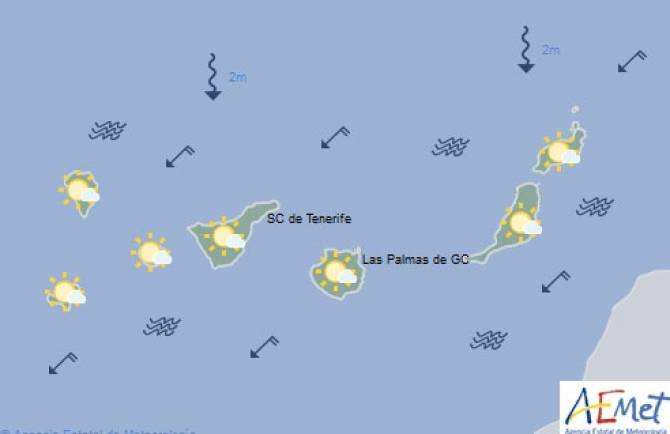 Viento del este moderado en medianías y zonas altas y del nordeste flojo a moderado en costas.