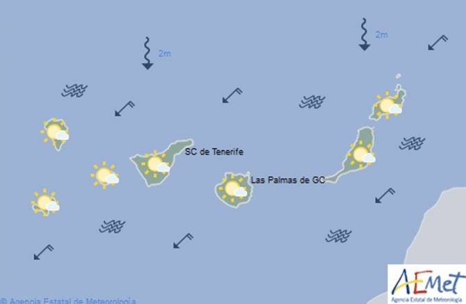 Viento del este moderado en medianías y zonas altas y del nordeste flojo a moderado en costas.