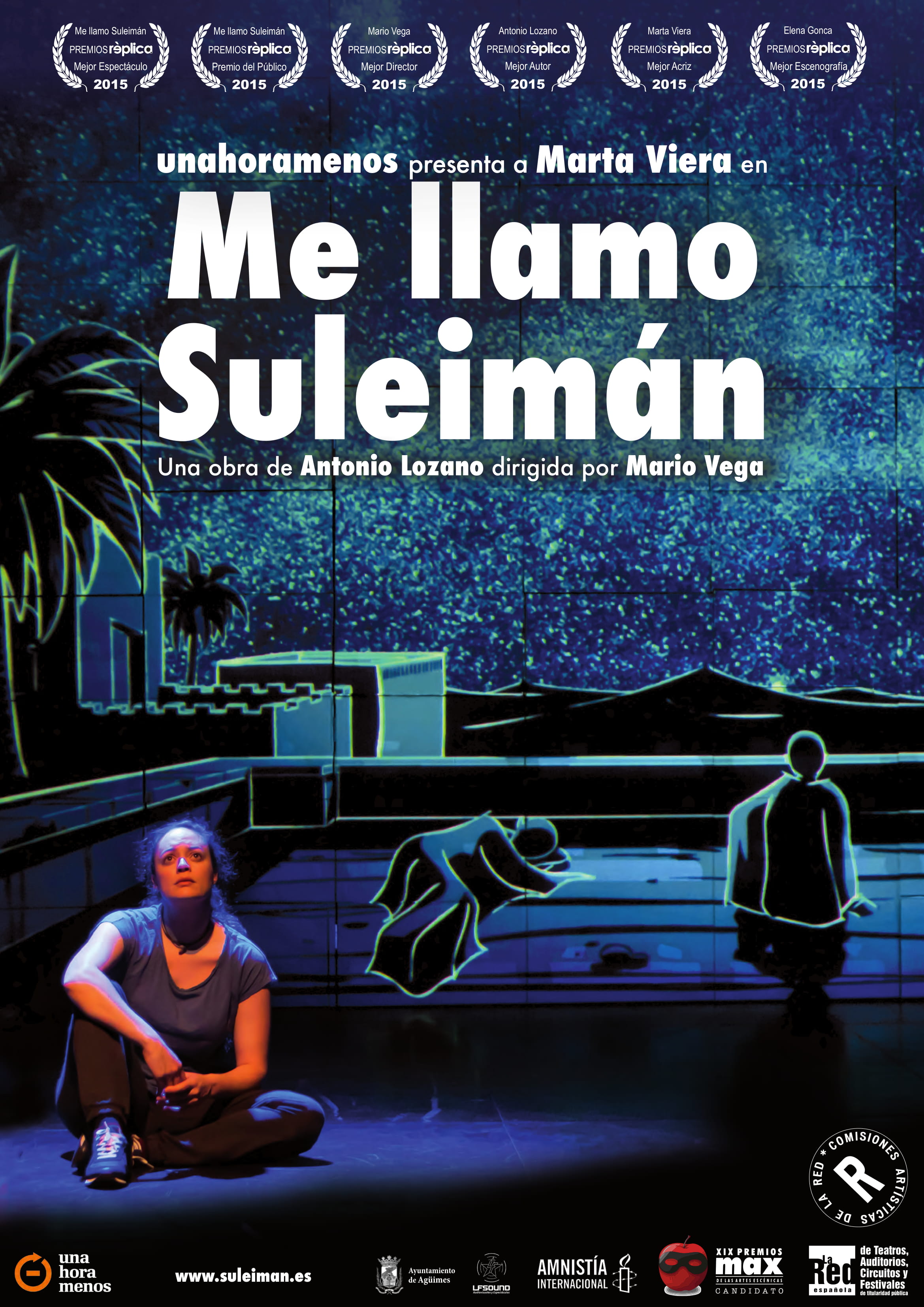 Galardonada con seis Premios Réplica en el año 2015, incluyendo Mejor Espectáculo, Dirección, Interpretación femenina, Autoría, Escenografía y Premio del Público, Me llamo Suleimán recala La Palma tras una larga gira de más de cien funciones en diferentes puntos del Archipiélago, la Península y en escenarios internacionales como el Festival de Manizales, en Colombia.