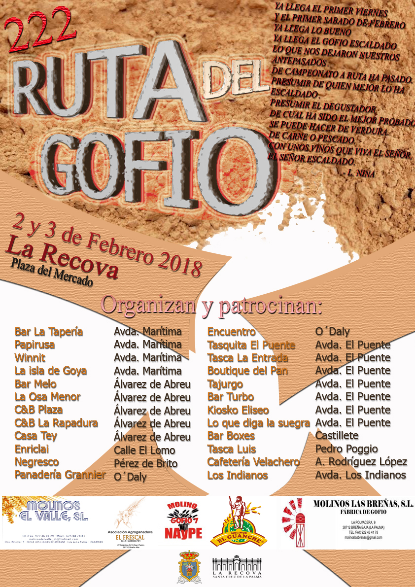 La Ruta del Gofio surgió hace ocho años como un acto de degustación impulsado por La Recova, que paulatinamente ha ganado la aceptación de establecimientos y consumidores hasta alcanzar la dimensión de una ruta gastronómica que viene a unirse a otras iniciativas de estas características impulsadas por la concejalía de Mercado, como la Ruta de la Carne de Cabra, la Feria del Vino, el Encuentro Enogastronómico o la Feria de la Garimba.