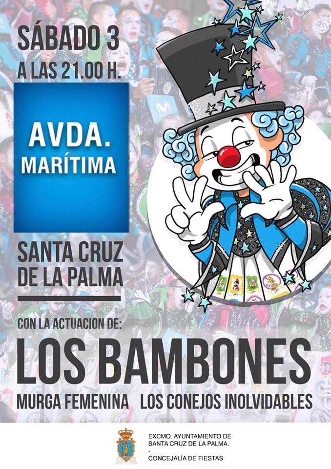 El Ayuntamiento de Santa Cruz de La Palma ha decidido trasladar la actuación de las murgas Los Bambones y Los Conejos Inolvidables a la Avenida Marítima, en lugar de la plaza de Santo Domingo, donde estaba previsto inicialmente, por cuestiones de aforo y operatividad. La función se mantiene en el horario previsto a las 21:00 horas y la entrada será gratuita.