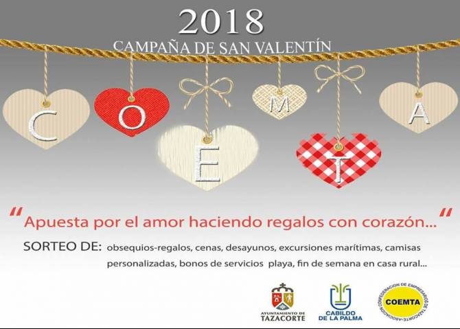 Desde la Agencia de Empleo y Desarrollo Local del Ayuntamiento de la Villa y Puerto de Tazacorte ha organizado conjuntamente con Coemta (Asociación Confederación de Empresarios de Tazacorte), con motivo del Día de San Valentín, acciones de dinamización comercial, se llevará a cabo desde el 7 de febrero al 14.