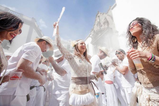 De los indianos dice que "es uno de los más antiguos y tradicionales de Canarias. Se celebra en Santa Cruz de La Palma, capital isleña, y conmemora la llegada de los indianos que regresan de hacer las Américas, así que los habitantes se visten de blanco y añaden a su indumentaria atrezo como baúles, jaulas con loros, cigarros".