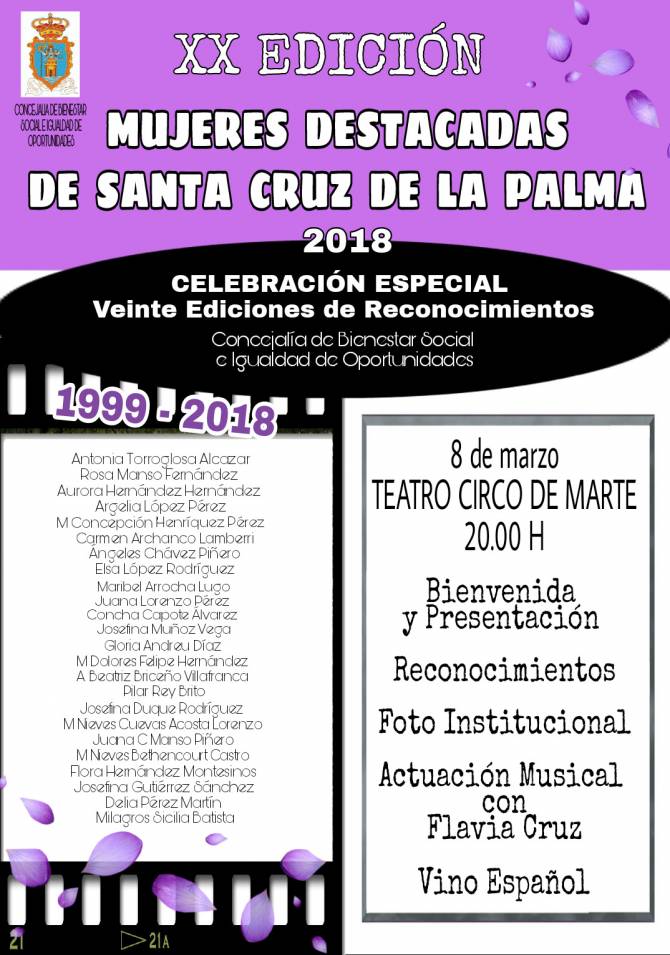 El acto contará con la presencia de muchas de las mujeres homenajeadas en estas dos décadas, si bien algunas ya han fallecido o no podrán asistir por encontrarse fuera de la isla. Mujeres Destacadas de Santa Cruz de La Palma han sido Rosa Manso, Antonia Toñi Torroglosa, Argelia Gela López, Aurora Hernández, María Concepción Hernández, Carmen Archanco, Ángeles Chávez, Elsa López, Maribel Arrocha Lugo, Juana Lorenzo, Concha Capote, Josefina Muñoz, Gloria Andreu, María Dolores Felipe, Angélica Briceño, Pilar Rey, Josefina Duque, María Nieves Cuevas, Juan Candelaria Manso, María Nieves Bethencourt, Flora Hernández Montesinos, Josefina Gutiérrez, Delia Pérez Martín y Milagros Sicilia. A todas ellas estará dedicada la presente edición del título de Mujer Destacada del Municipio.
