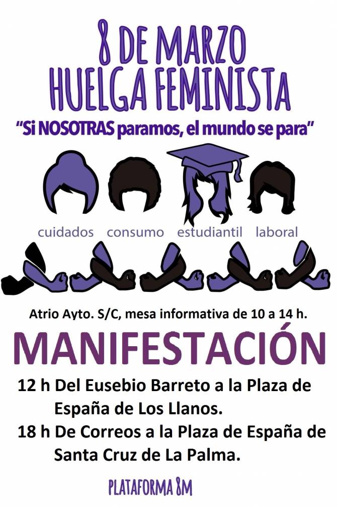 El Ayuntamiento de Santa Cruz de La Palma muestra su apoyo a la huelga convocada el jueves 8 de marzo con motivo del Día Internacional de la Mujer en su reivindicación por alcanzar la igualdad de géneros y combatir la discriminación y la violencia hacia las mujeres.