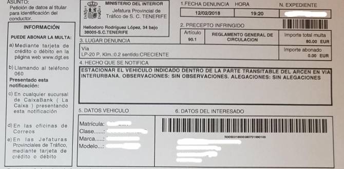 En las notificaciones se especifica que los vehículos estaban estacionados "dentro de la parte transitable del arcén en la vía interurbana".