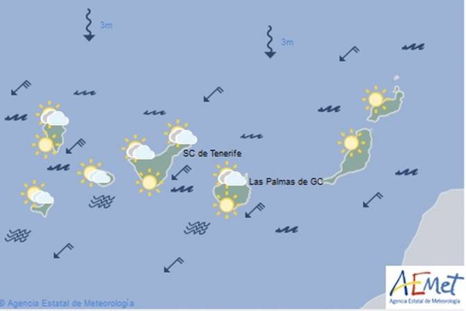 Viento del nordeste moderado a fuerte, siendo más flojo en la costa suroeste, disminuyendo a lo largo del día. Rachas muy fuertes a primeras horas, superiores a 70 km/h en zonas altas y noroeste y sudeste de la isla.