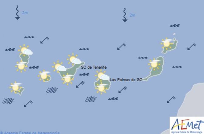 Viento del nordeste moderado a fuerte en la primera mitad del día, más intenso en zonas altas y en vertientes noroeste y sudeste, donde las rachas podrían llegar puntualmente a los 65-70 Km/h, amainando después. Brisas en costa suroeste.