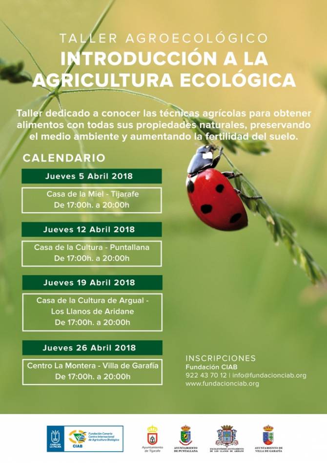 El Cabildo Insular de La Palma, a través del Servicio de Agricultura, Ganadería y Pesca, y la Fundación Centro Internacional de Agricultura Biológica (CIAB) ponen en marcha una jornada formativa itinerante sobre introducción a la agricultura ecológica que, durante el mes de abril, se desarrollará en cuatro municipios de la isla. El objetivo es informar a los agricultores y consumidores sobre las técnicas y normativa asociada a este tipo de producción.