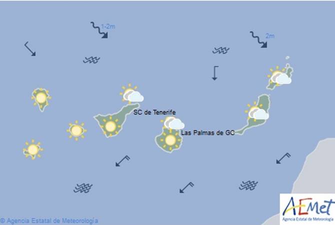Viento de componente norte flojo a moderado, predominando las brisas en costas, girando a noroeste moderado por la tarde, cuando será más intenso en punta nordeste, no descartándose algunas rachas en cumbres y medianías.