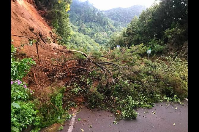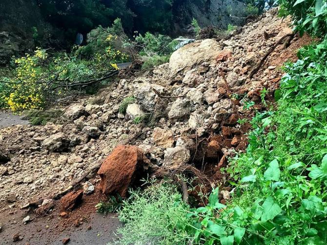 La carretera de Las Mimbreras, en su vertiente del municipio de Barlovento, ha sufrido un fuerte desprendimiento, lo que ha obligado a la intervención de los servicios municipales y de carreteras insulares.