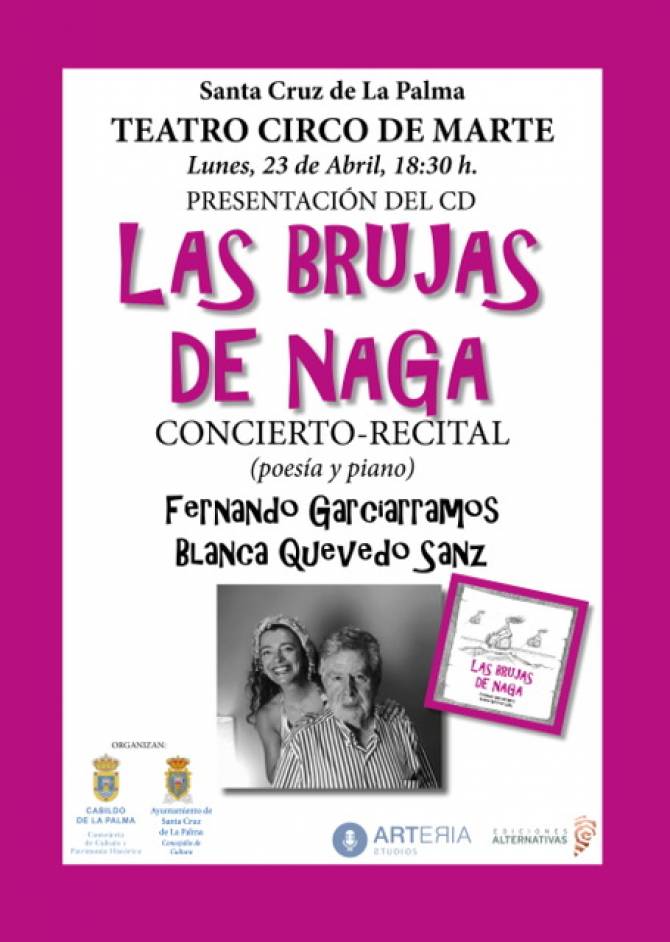 A las 18:30 horas, el Teatro Circo de Marte acogerá un recital poético musical que servirá de presentación del el CD Las Brujas de Naga, basado en el poemario inédito que Fernando Garcíarramos, escultor y poeta, entregó a Blanca Quevedo para que pusiera música a algunos de sus poemas. Al escuchar sus composiciones viajamos desde sonoridades que recuerdan a la música francesa de finales del XIX, a un fado portugués, a un blues o a una isa canaria. Este trabajo nace cuando los dos artistas canarios cruzan sus trayectorias vitales y se enorgullecen de compartir su afición y devoción por la Cordillera de Anaga.