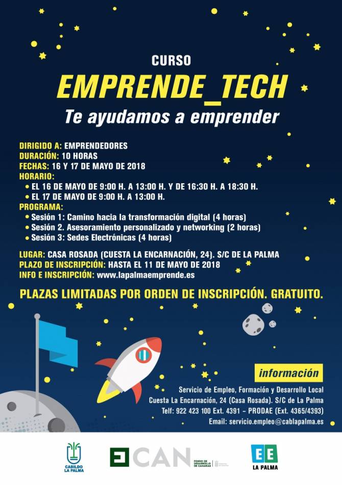 Este curso gratuito, que se desarrollará en la Casa Rosada en Santa Cruz de La Palma, está cofinanciado con fondos FDCAN en la línea estratégica 3 de Apoyo a la Empleabilidad (anualidad 2017) dentro de la acción denominada La Palma Emprende, con diploma de asistencia a las personas participantes y con plazas limitadas.