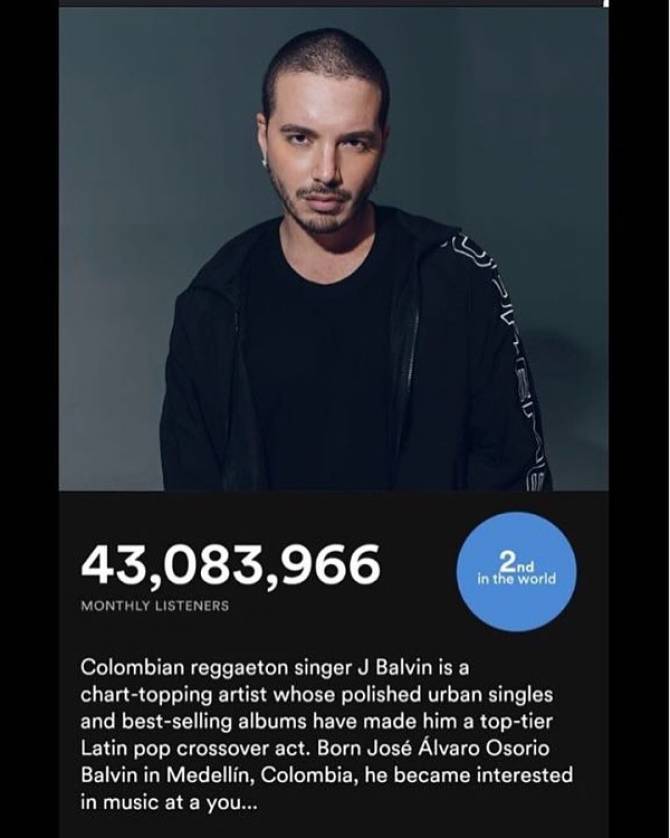 El artista principal de las Fiestas Trienales de la Bajada de El Pino, que actuará en el municipio palmero de El Paso el próximo sábado 11 de agosto como todo un acontecimiento musical para los jóvenes de la Isla Bonita (acostumbrados a volar para ver a este tipo de artistas en otras islas de mayor población), se ha confirmado como el indiscutible entre los latinos, con más de 43 millones de plays en Spotify, un record actual que lo sitúa en el Nº2 mundial y que se suma a su otro record como artista con más visualizaciones en Youtube durante 2017, con temas como "Mi Gente", interpretada unto a Beyoncé, recientemente elegida mejor canción latina de 2017.