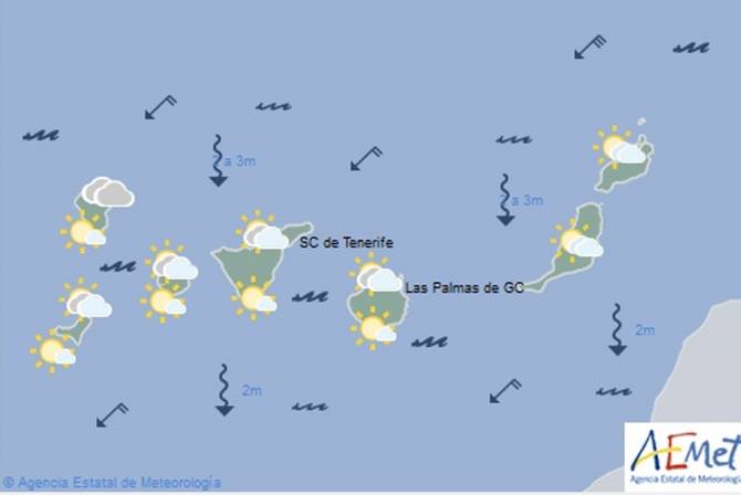 La previsión meteorológica para este lunes en La Palma apunta a la existencia, en el nordeste y este, por debajo de 1200 a 1300 metros, de cielos nubosos con baja probabilidad de alguna lluvia débil, ocasional y dispersa a primeras horas en medianías, por la tarde se abrirán claros.