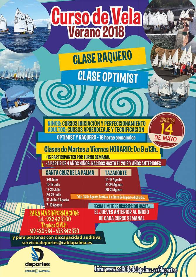 El Cabildo de La Palma, a través del Servicio de Deportes, ha abierto el periodo de inscripción para los cursos de vela que se desarrollarán durante los meses de julio y agosto en los municipios de Santa Cruz de La Palma y Tazacorte.