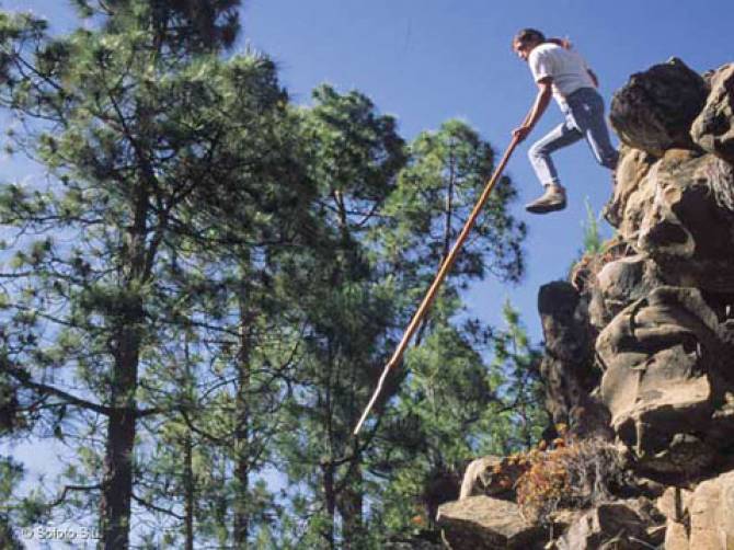 A la hora de ejecutar sus desplazamientos por la escarpada orografía de las islas, el pastor suele usarla para salvar desniveles más o menos pronunciados, siendo su uso más espectacular el de bajar laderas de pronunciada pendiente en una serie de saltos continuados en busca de una persona, un animal extraviado o herido o, simplemente, para acortar el camino.