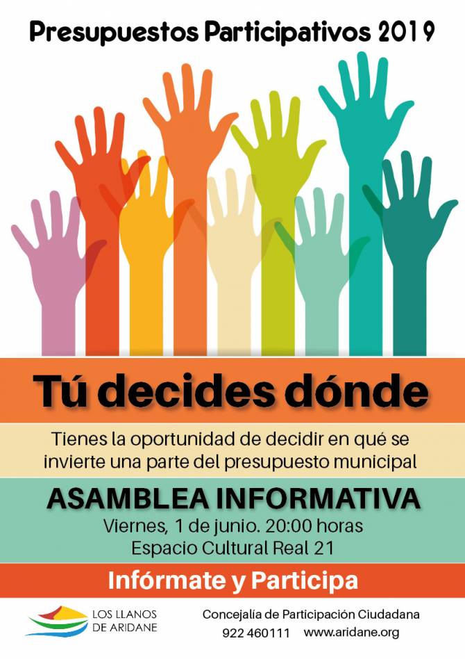 El Ayuntamiento de Los Llanos de Aridane, a través de sus concejalías de Hacienda y participación Ciudadana, ha convocado a la ciudadanía aridanense a la Asamblea Informativa, que se celebrará mañana viernes 1 de junio a las 20:00 horas, en el Espacio Cultural Real 21, sobre el proceso de Presupuestos Participativos que se pondrá en marcha de manera inminente.