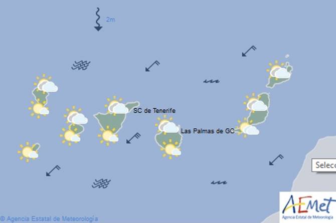 Baja probabilidad de lluvias débiles y ocasionales en el nordeste, principalmente en medianías, durante la primera mitad del día y a últimas horas.