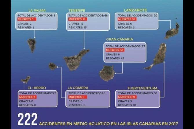 El mapa, que elabora esta plataforma por segundo año consecutivo, recoge 131 playas, puntos de costa y piscinas localizados en 50 de los 88 municipios canarios, donde se registraron 222 accidentes acuáticos, con un total de 93 fallecidos, el pasado año.