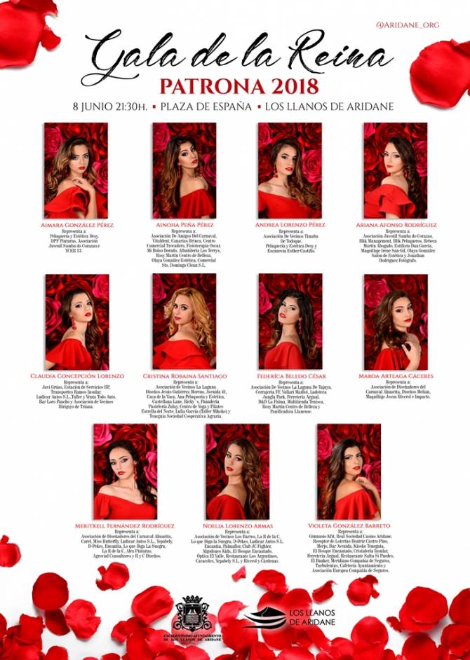 Un total de once jóvenes aspiran a convertirse mañana viernes, día 8 de junio, en Reina de la Patrona de Los Llanos de Aridane 2018. La Gala, que se celebrará en La Plaza de España, dará comienzo a partir de las 21:30 horas. La presentación correrá a cargo de Emilia González y durante el transcurso de la noche actuarán sobre el escenario grupos locales así como el Grupo de Danza de Las Palmas y Guancheck, ganador de la segunda edición del talent show Acapela.