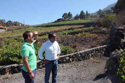 Durante la visita ambos representantes del Gobierno canario se desplazaron a El Paso, acompañados por el alcalde de el municipio, Sergio Rodríguez, donde recorrieron explotaciones de vid en Las Manchas que han sufrido las consecuencias del incendio. Según pudieron comprobar el viñedo ha desempeñado un papel clave en su contención aunque ha sido el cultivo más afectado por este hecho, al que se suman las consecuencias de la climatología atípica del último invierno.