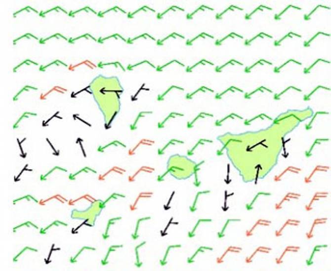 Viento del nordeste flojo a moderado, más intenso en las costas sureste y punta noroeste, en donde serán probables rachas que alcancen los 60 kilómetros por hora.