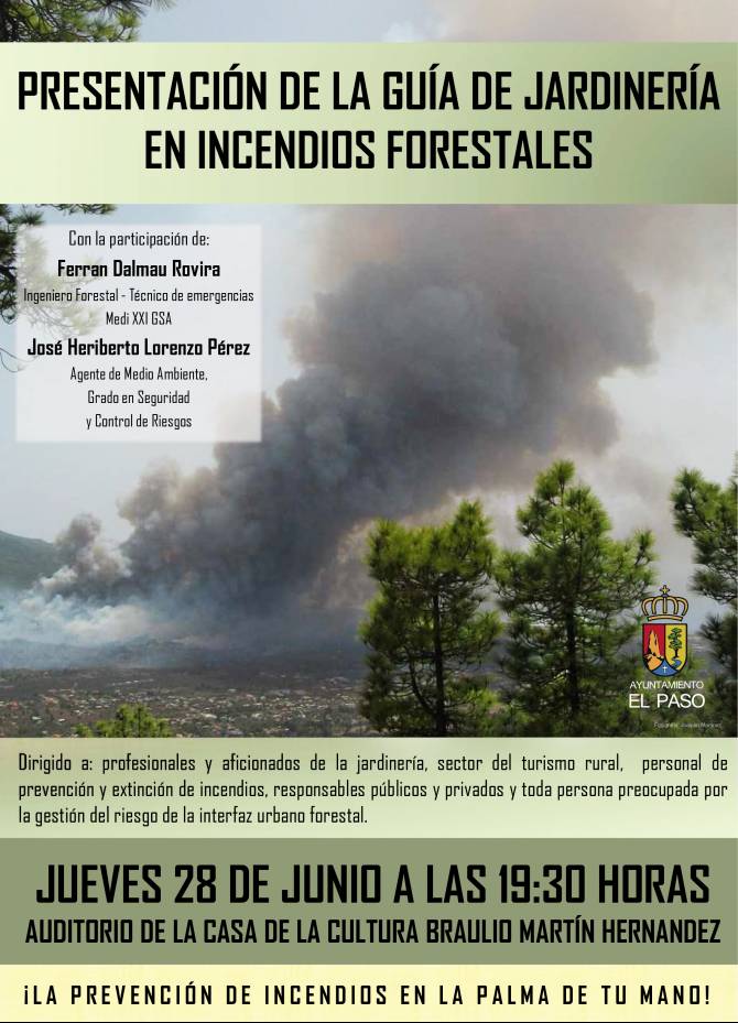 Este próximo jueves día 28, en el auditorio de la Casa de la Cultura Braulio Martin Hernández de El Paso, se presentará la “Guía de jardinería en incendios forestales”, con la participación de Ferrán Dalmau, ingeniero forestal-técnico de emergencias Medi XXI GSA, y de José Heriberto Lorenzo, agente de Medio Ambiente, grado en Seguridad y Control de Riesgos.
