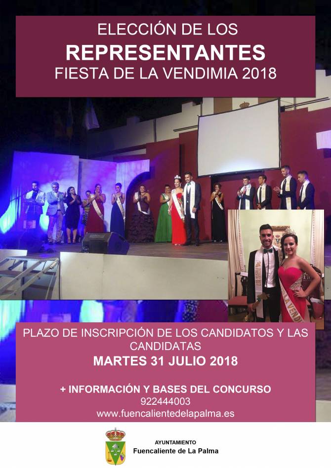 El Ayuntamiento de Fuencaliente de La Palma ha hecho públicas las bases del concurso de elección del Representante y la Representante de la Fiesta de La Vendimia 2018. Un concurso que se celebrará en el marco de una Gala de Arte el jueves 17 de agosto, día en que arranca la festividad este año.