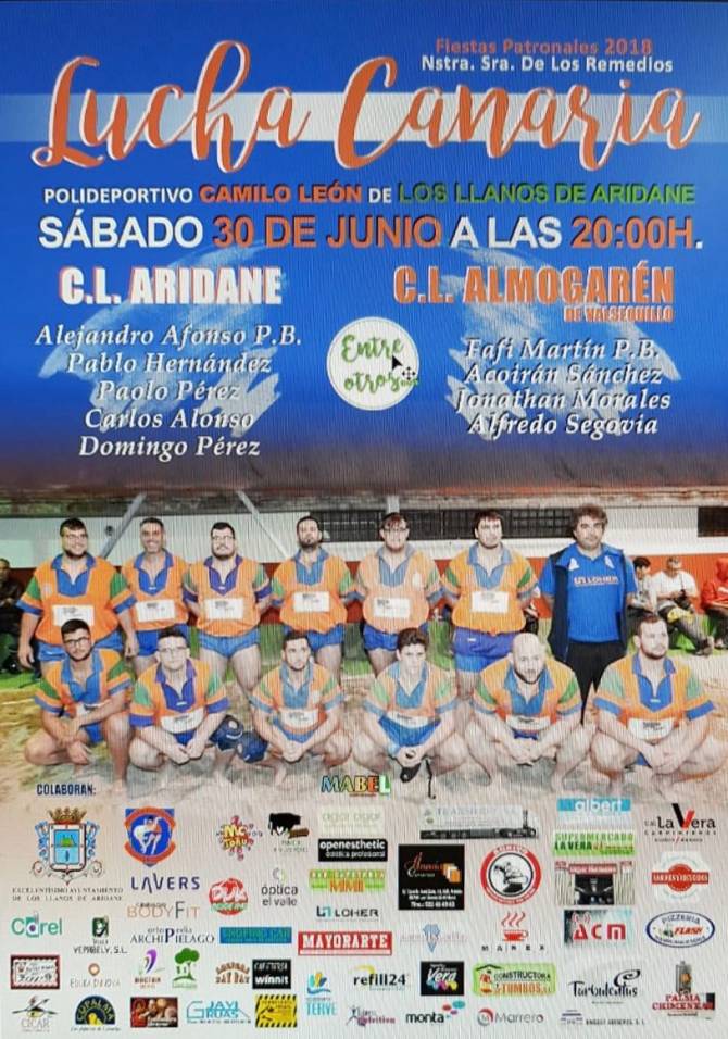El Polideportivo Camilo León de Los Llanos de Aridane acoge este sábado, día 30 de junio, a partir de las 20:00 horas la II Luchada Institucional de las Fiestas de La Patrona 2018. Un encuentro amistoso en el que participan luchadores del Club de Lucha Aridane y del Club Deportivo Almogarén de Gran Canaria, que se batirán sobre el terrero para rendir su particular homenaje a la Virgen de Los Remedios.