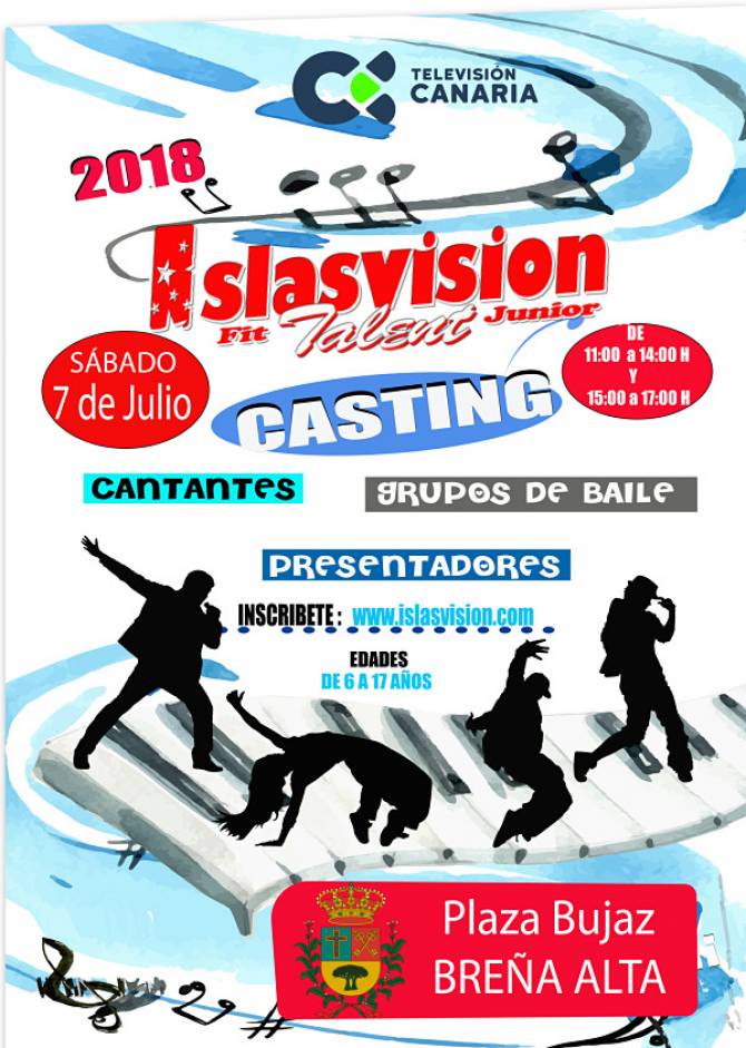 El próximo sábado 7 de julio, la Plaza Bujaz de Breña Alta acogerá el casting Islasvisión Fit Talent Junior School 2018 para las modalidades de canto, grupos de baile, tributos, musical y presentadores. El horario previsto es entre las 11:00 y las 14:00 horas y de 15:00 a 17:00 horas.