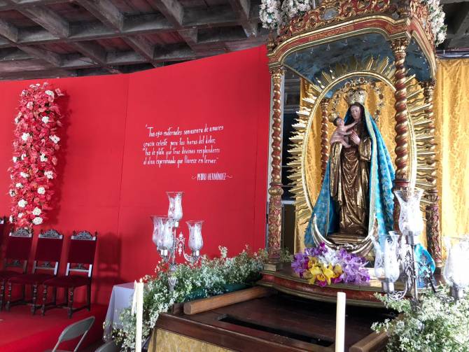 Con su templo matriz en obras, y desde el altar ubicado en los bajos de la Casa de la Cultura, la Patrona lucía con esplendor en un altar de fondo rojo, símbolo del amor que su pueblo le profesa, en cuyo centro lucía el símbolo mariano adornado con dos columnas de anturios rojos y margaritas blancas, a cuya izquierda rezaba una frase de Pedro Hernández en la que se podía leer “Tus ojos maternales son aurora de amores gracia celeste para las horas del dolor luz de plata que trae divinos resplandores al alma esperanzada que florece en fervor”.