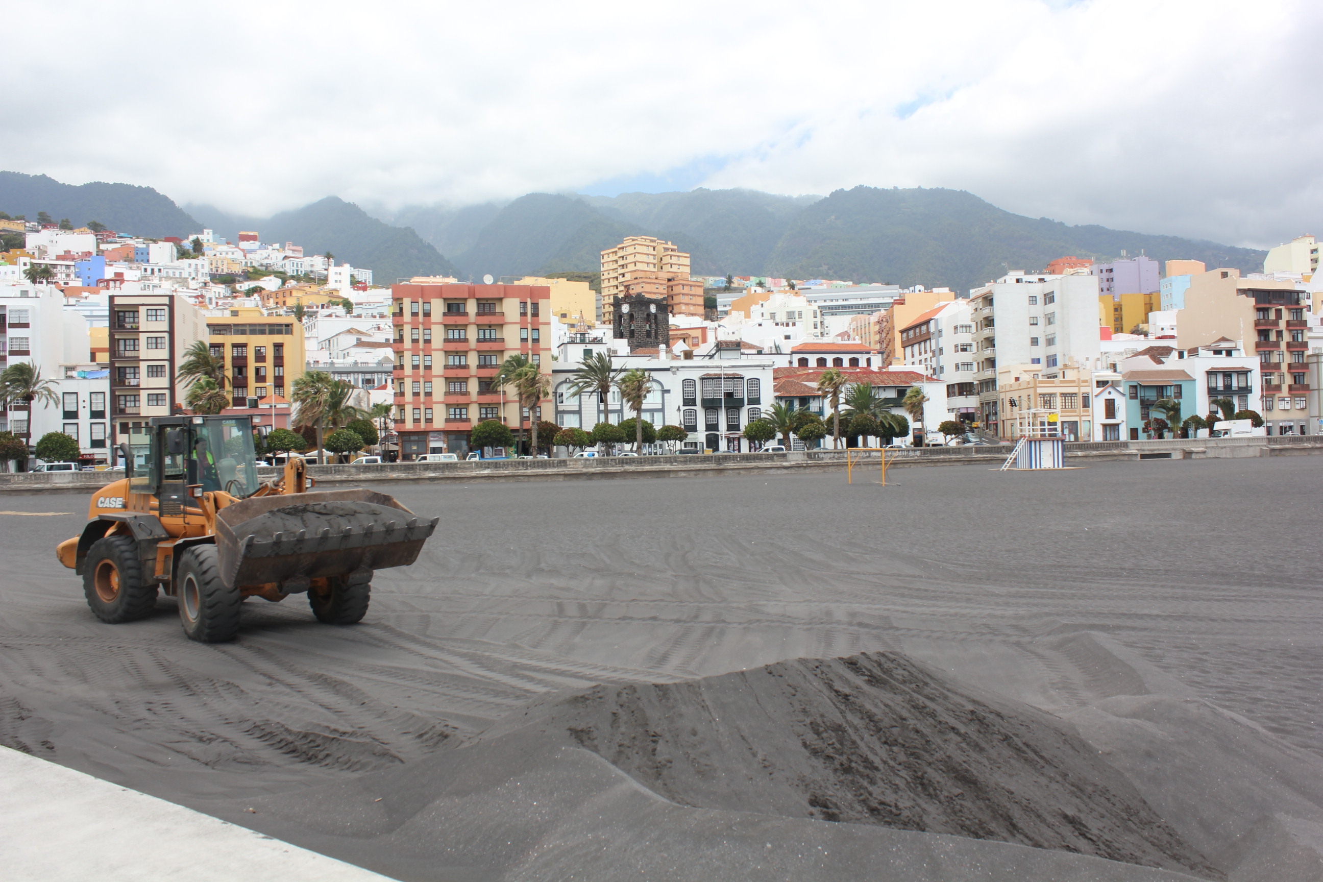 El Ayuntamiento de Santa Cruz de La Palma está llevando a cabo durante el día de hoy trabajos para recolocar la arena de la playa acumulada por la acción del viento tanto en los accesos como en el espigón sur.