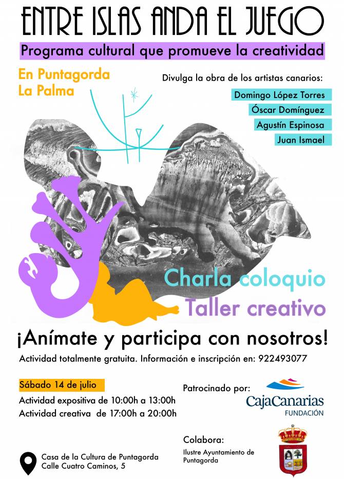 La Fundación Cajacanarias junto con Art Volaverun y en colaboración con el Ayuntamiento de Puntagorda organiza el próximo sábado día 14 de julio la actividad ‘Entre Islas anda el Juego’. Una iniciativa que forma parte de un programa educativo y cultural encaminado a promover la creatividad entre los asistentes, así como a dar a conocer más en profundidad la obra de los artistas canarios Juan Ismael, Óscar Domínguez, Agustín Espinosa y Domingo López Torres.