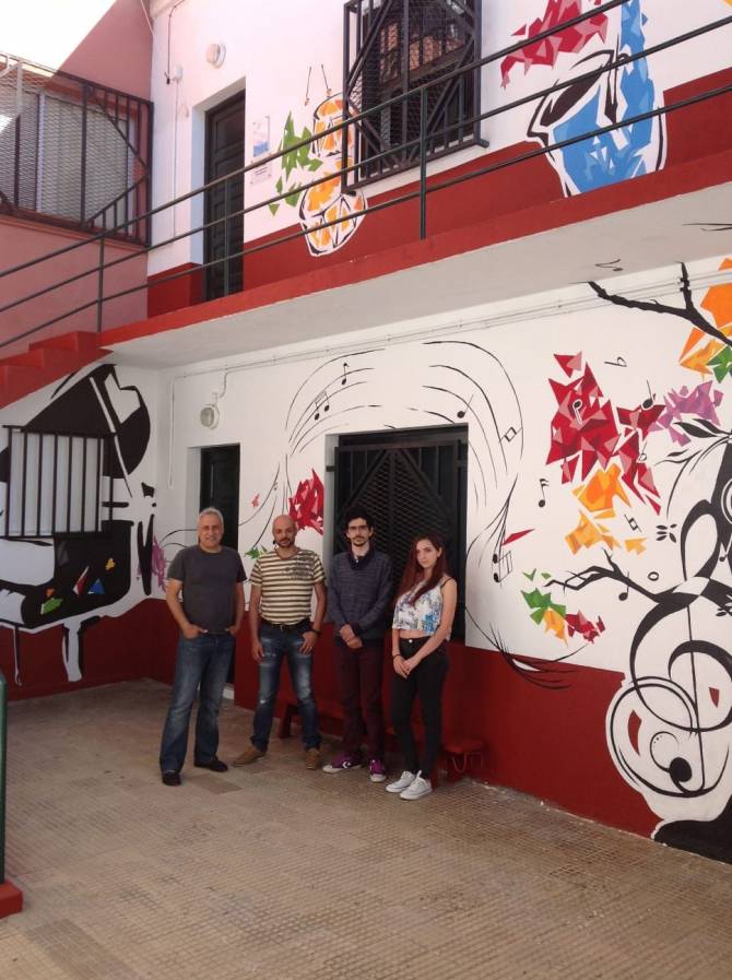 El trabajo ha plasmado un programa iconográfico relativo a las actividades de enseñanza musical que se imparten en el centro. La obra ha perseguido el empleo del cromatismo artístico como base desde la cual contribuir a la rehabilitación de un rincón deteriorado a través de la técnica tradicional de la pintura acrílica.